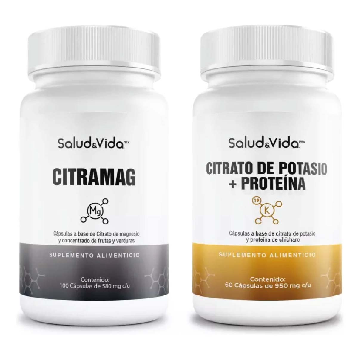 Contiene 100 cápsulas de citrato de magnesio y 60 cápsulas de citrato de potasio
